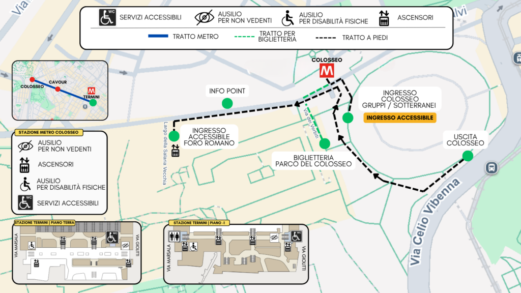 Dalla Stazione Termini, attraverso un percorso accessibile con la linea B della metropolitana, si raggiunge il Colosseo e il Foro Romano, parte del Parco Archeologico del Colosseo. Le stazioni sono dotate di ascensori, rampe e varchi dedicati, con pavimentazioni regolari e percorsi assistiti. L’area archeologica presenta tratti pianeggianti e punti attrezzati, anche se la pavimentazione in sampietrini o pietra antica può risultare irregolare in alcuni tratti.