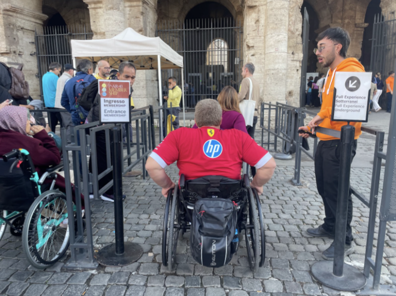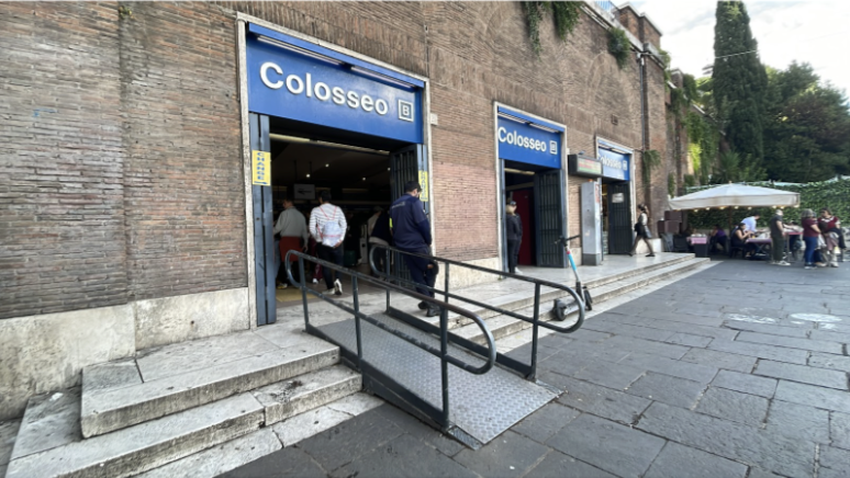 Chi è già in possesso del biglietto può procedere verso sinistra dalla stazione metro Colosseo: dal semaforo, si attraversa la strada e si continua per pochi metri fino all’ingresso principale. L’entrata accessibile è quella laterale, adiacente all’ingresso per i gruppi e i sotterranei, dotata di rampa metallica e pavimentazione più liscia rispetto agli altri ingressi.