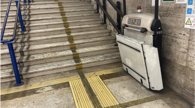 Superata la seconda scala, si percorrono pochi metri in piano e si raggiungono i tornelli di uscita, di cui uno dedicato a sedie a rotelle o ausili motorizzati. Dopo i tornelli, si cammina fino all’uscita principale. Sono presenti due piccoli scalini, ma sul lato destro è disponibile una rampa che consente di raggiungere il livello del marciapiede in modo agevole.