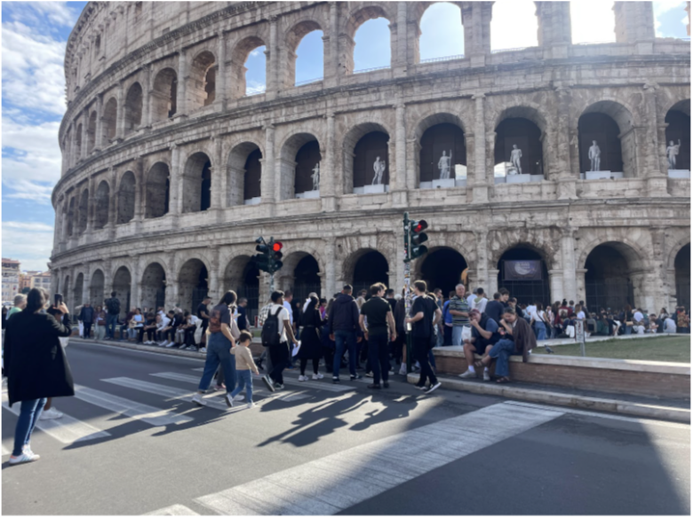 L’arrivo avviene nella piazzetta antistante la stazione della metro B “Colosseo”, direttamente davanti all’ingresso del parco archeologico. La zona di sosta taxi è ampia e in piano; la pavimentazione è in asfalto e sampietrini regolari.