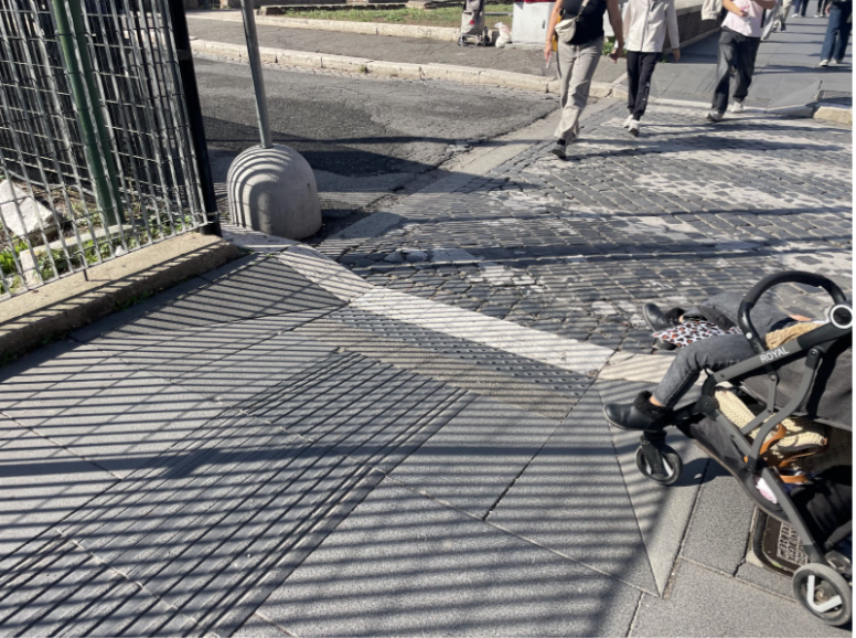Senza attraversare la strada, si gira a sinistra e si prosegue lungo il marciapiede di via dei Fori Imperiali, pianeggiante e regolare, con tratti in asfalto e sampietrini stabili.